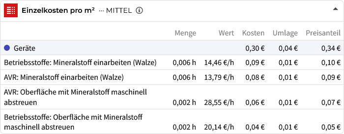Beispiel für detaillierte Mengenangaben und Baustoffkosten einer Leistung bei baupreislexikon.de